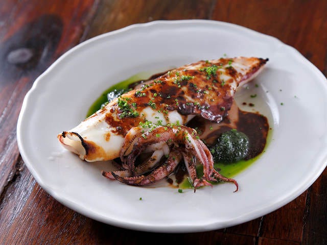イカと栗という意外な組み合わせに驚く「小ヤリイカの網焼き 栗とパセリのソースで」(写真上)は、網焼きしたミディアムレアのイカに赤ワインベースのソースをかけ、そこにフランス産の栗を使ったピューレとパセリのグリーンソースを合わせている。口に運ぶと、イカと栗ピューレの驚きのマッチングに感動するはずだ。