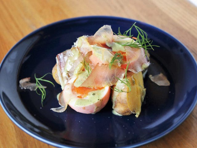 サクサクの衣に包まれたタラの風味を引き立てるのは、ビーツ100%ジュースと、豆乳でつくった自家製マヨネーズを合わせたピンク色のソースだ。ホロっと崩れるタラのうまみ、酸味のあるまろやかなソースが絶妙なハーモニーを奏でる。