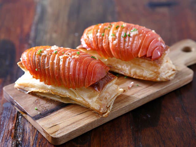 スイーツのような見た目のパイは、濃厚な甘みとうまみを持つトマトとサクッと軽い生地を同時に味わってもらうために”賞味期限1分”となっている。撮影もそこそこに、パクっといただこう。
