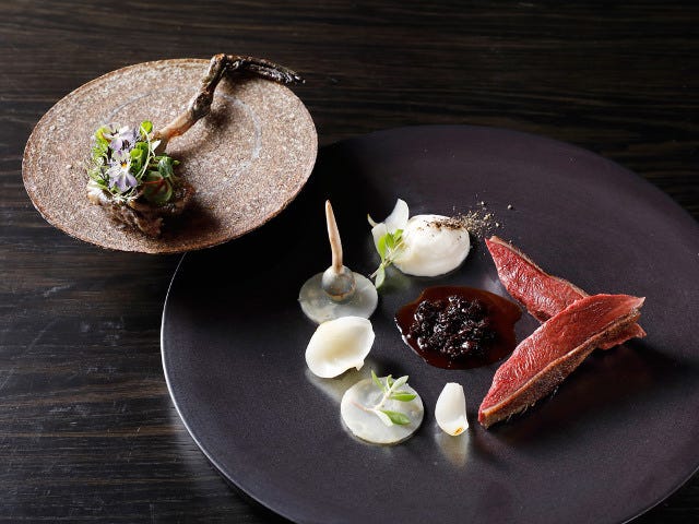 料理はその時季の食材を使ったものばかり。取材日は「鹿児島県出水市産の天然尾長鴨」や「北海道産の天然蝦夷鹿」「北海道産のヒグマ」などのジビエのほか、「天然尺ヤマメ」といった魚料理をラインナップ。炭の輻射熱(ふくしゃねつ)で火入れしていき、完璧な料理へと仕上げていく。