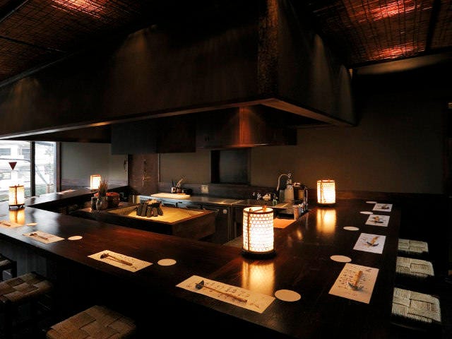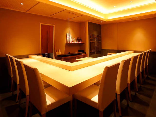 暖簾をくぐりエントランスに入ると、格子戸の隙間から店内がうかがえる。目に飛び込むのは、やわらかな照明に照らされた美しいカウンター。この11席のカウンターは木曽ヒノキで造られたもので、新しい木の香りの清々しさを感じるとともに、厚み10㎝の立派な材木に見惚れてしまう。
