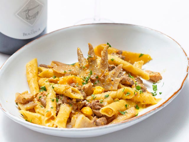 写真上は「鶏のレバー・ハツ・トサカ・胸肉ラグー カンネッリ」というパスタ料理。鶏のトサカを使った珍しい一品で、シェフがボローニャで働いていたときに学んだ料理だという。