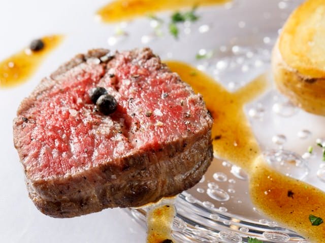 ある日のメインの肉料理は表面だけをかっちり焼き、中は非常にやわらかい仙台の「漢方牛」(写真上)。フィレとはいえA4~A5クラスの肉は脂がのっているので、やや強めに塩コショウを振るだけで十分においしい。
