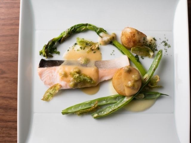 味噌を練り上げ、蕗の薹を加えて作られたソースはほろ苦く、桜マスのたんぱくな味わいを引き立てる。