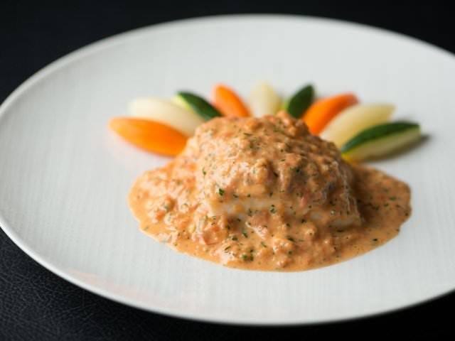たとえば、「ヒラメのデュグレレ風」(写真上)は、刻んだトマトとバターでなめらかに仕上げたソースがたっぷりかかった一皿。ふっくらと仕上げたヒラメのうまみと相まって、濃厚な味わいに仕上げている。季節の食材に応じてシェフが独創的な料理を作り上げるので、その内容もさまざま。