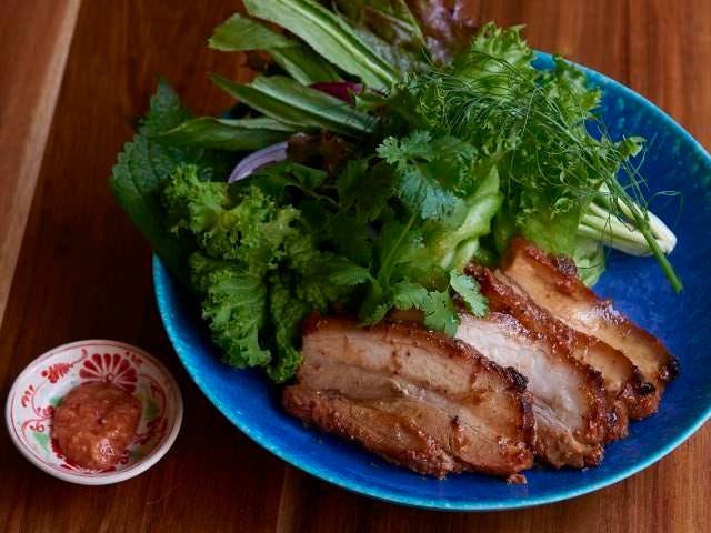 腐乳を使ったタレは独特の発酵臭をまとい、濃厚なコクと塩気がある。それらの風味を移した豚バラ肉は、まろやかで複雑な味わい。たっぷり添えられた葉野菜やハーブに包んで満喫したい。