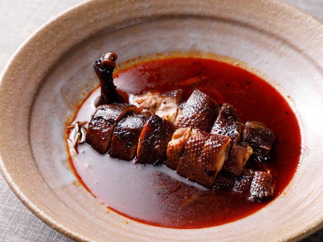 料理は、全11品程度から成るコースのみ。旬の食材を使った色とりどりの料理が展開される。本稿では同店のスペシャリテ「鴨 四川火鍋スープ仕立て」(写真上)を紹介。氷砂糖と醤油で30分以上かけて煮詰めた和歌山県産の鴨を、20種類のスパイスが入った醤(ジャン)をベースとする火鍋でいただくこちらの一品は、濃厚なうまみがどこまでも後を引く。