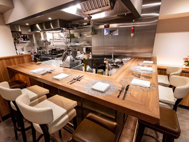 お店の特等席は、ライブ感溢れるカウンター席。L字カウンターの角の内側には、揚げ物用の鍋を設置する。「天ぷら屋さんを参考にした」と高橋さんが言うように、よくあるイタリア料理店とはまた違った雰囲気で食事を楽しむことができる。