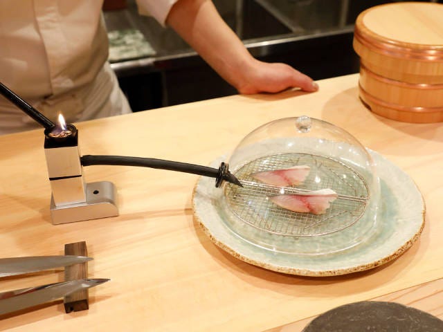 カウンター鮨ならではのライブ感! 目の前で仕上げる鯖の瞬間スモーク