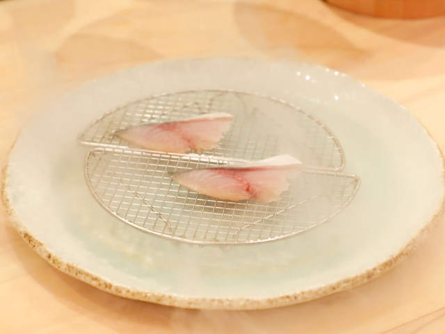 今回は塩で下味をつけた国産の鯖の醤油漬けを、魚の香りを邪魔しない桜のチップで4~5分、器の中で燻す。
