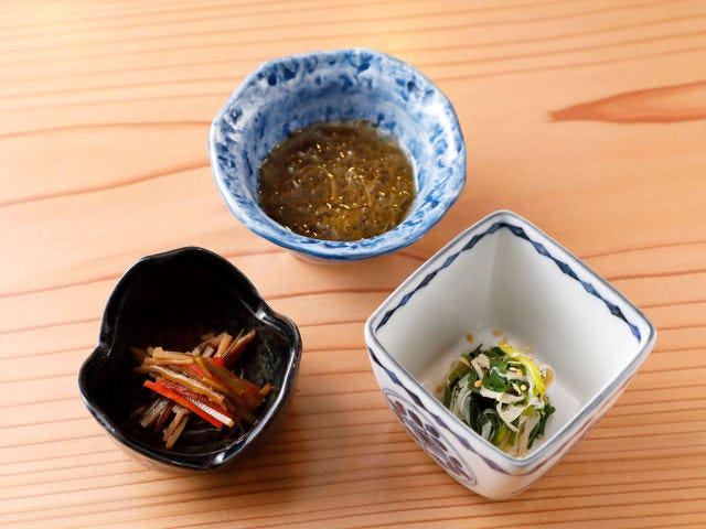 まずはお通し3品。こちらは鮨の邪魔をしないような小鉢を定期的に内容を変えて用意。取材日は北陸産の「もずく酢」(写真上・上)、「湯葉と芹のおひたし」(同・右)、自家製の「松前漬け」(同・左)。