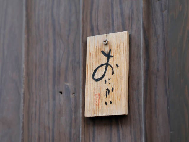 住所は合っているのに入り口がわからない。そこで目の前の古民家に近付くと、小さな名刺サイズの表札とおぼしきものとドアノブが…。