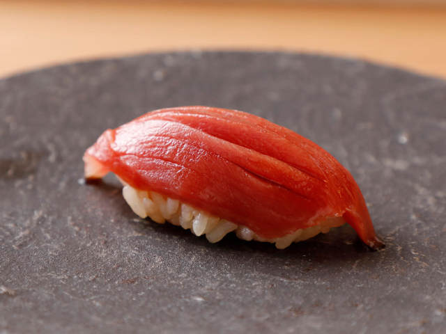 合わせるのは福井県産コシヒカリを使い、赤酢で仕上げたシャリ。マグロに合う酸味のきいたシャリだが、ほのかな甘みもあり、とてもバランスがいい。