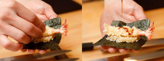 最後に出してもらったのは、なんと他の店ではなかなか見ることのできない“特別な”スペシャリテ。なんと1階にある『天婦羅 みやしろ』の海老天を使った「海老天巻き」(写真下)。