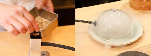 仕上がった「鯖の瞬間スモークの握り」(写真上)をひと口食べると、口の中に爽やかな香りが一気に広がり、そしてすっとシャリと馴染む。
