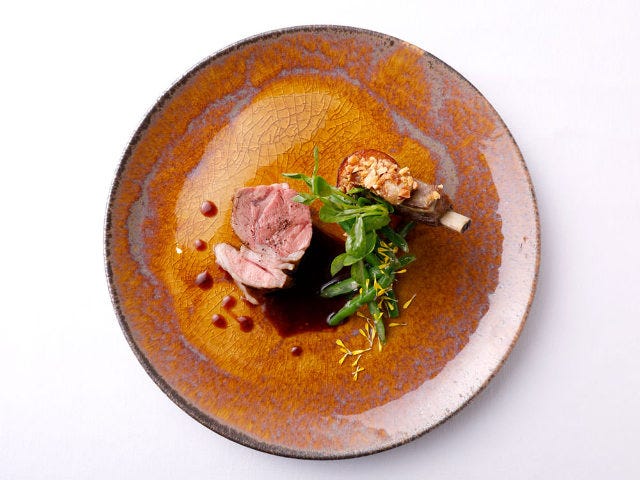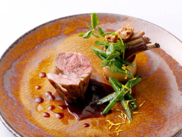 瑞々しい緑が春を思わせるインゲンは、ビネグレットでマリネ。ポイントとなるソースは、焼いた仔羊の骨からとったジュ(だし)。ギュッと凝縮されると醤油のような塩味が引き出され、コクのあるソースが肉のうまさに深みを増してくれる。