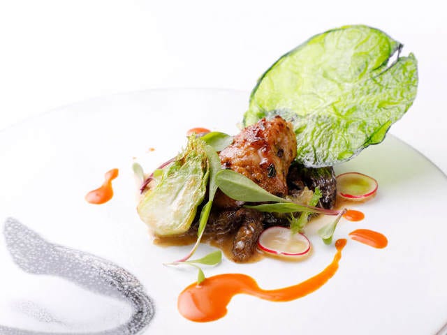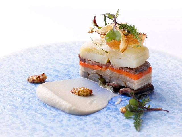 牛ほほ肉と、ナス、ゴボウ、アンディーブ、春キャベツなどをポトフのようにコンソメでやわらかく煮て、重ねて層にした、野菜が主役の前菜。野菜をゴロッと大ぶりにカットすることで、それぞれの野菜が持つ食感と、甘みや苦味といった味のバランスが楽しめる。