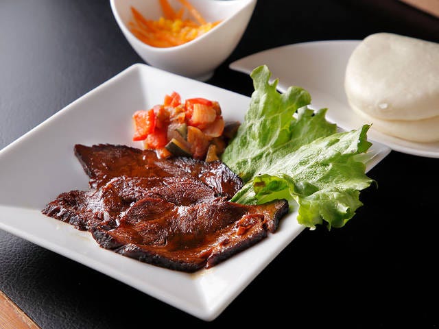牛ホホ肉に醤油、みりん、数種類をブレンドした古酒を加えてやわらかくなるまでじっくりと煮込み、蒸しパンとパプリカのマリネを添えた一品。とろけるようにやわらかな牛肉に、古酒の濃厚なうまみがじんわりと溶け込んでいます。