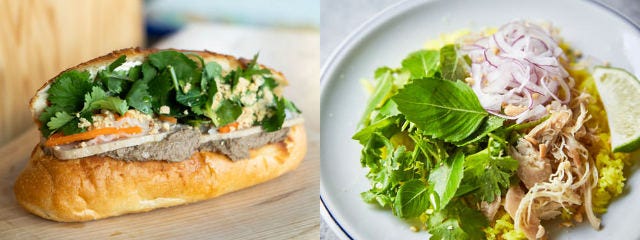 テイクアウトは、しばらくお休みしていたが、期間限定で復活。人気の「バインミー」(写真上)の他に、自家製鶏スープで炊いたジャスミンライスにたっぷり鴨肉のコンフィをのせた「チキンライス鴨肉仕立て」(同・上)や本格スパイスのカレー、極細米麺を甘酸っぱいタレで和えた「ボブン」など『スタンドバインミー』ならではのベトナム料理がそろっている。