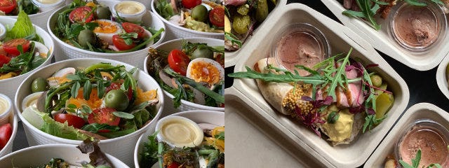 午後から販売の「フレンチ惣菜BOX」は、肉の存在感あふれるパテカンなどワインが進みそうな惣菜がぎっしり。シェフのセンスあふれたビストロ料理を家でも楽しみたい。