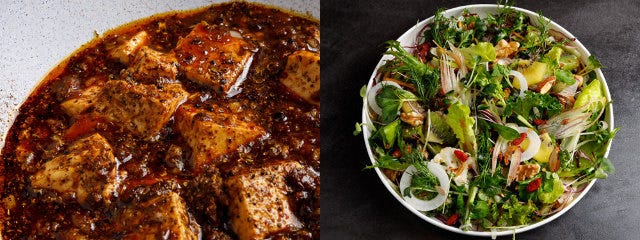 『銀座アスター』で本格的な中華料理を学んだオーナーシェフの濱田利彦さん。人気メニュー、徳島県産「阿波牛」を使った「麻婆豆腐」(写真上・左)は、燃えるような辛味とうまみにノックアウトされるおいしさ。その他、実家が農家だという濱田シェフが「野菜をたっぷり食べてほしい」という思いを込めて、30種類以上の野菜を使い、ナッツやシードなどをトッピングした「detox salad」(同・右)もおすすめ。シャキシャキ、カリカリとバラエティに富んだ食感が楽しいサラダだ。