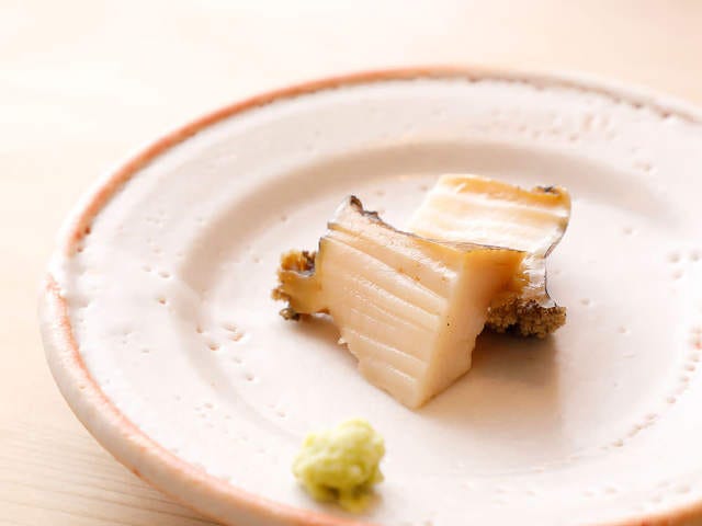 『鮨まつうら』の鮨や一品料理は正統派。つまみの「岩手県産 黒鮑」(写真上)はアワビのうまみを生かすため、お酒と昆布、塩で蒸しただけ。ひと口噛むと驚きのやわらかさを感じ、アワビ独特のうまみが喉を突き抜ける。この食感は4時間、静かな火で蒸すことで実現するそうだ。素材を生かしたシンプルな味こそ、時間のかかるものだと痛感する。