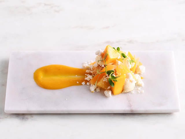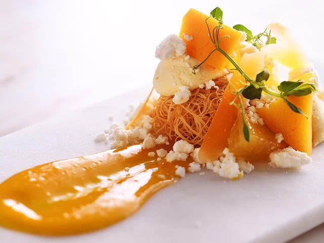 マンゴーと柑橘を合わせたカダイフ(極細の綿状の生地)の軽いタルトには、3種のチーズをトッピング。