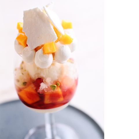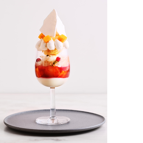 3皿目は、『フルーツサロン』自慢のパフェが登場。マンゴーをふんだんに使ったマンゴージェラートや、爽やかな味わいのヨーグルトジェラートに、生姜のグラニテ(シャーベット状の氷菓子)や旬の果実を合わせた華やかな一品に。