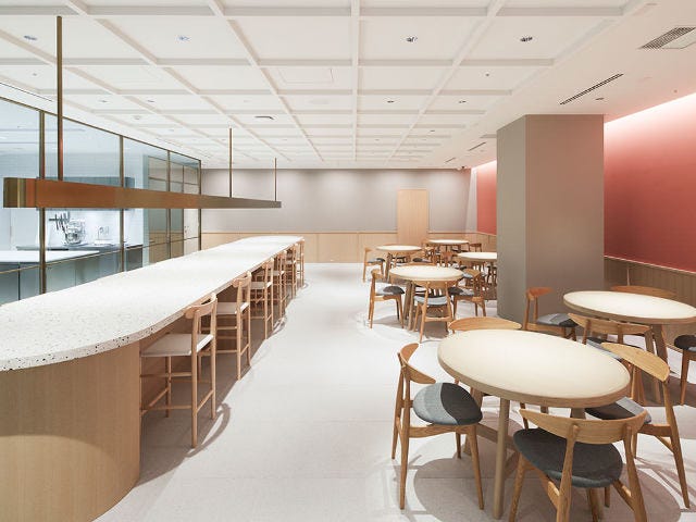 季節毎にフルチェンジするメニューは、代々木上原の人気パティスリー『BIEN-ÊTRE PÂTISSERIE(パティスリー ビヤンネートル)』のオーナーパティシエ・馬場麻衣子さんが監修。席は完全予約制となっており、ガラス張りのオープンキッチンが見渡せる開放的な店内で、ゆったりとした時間を過ごすことができる。