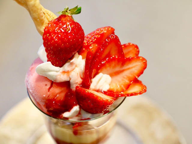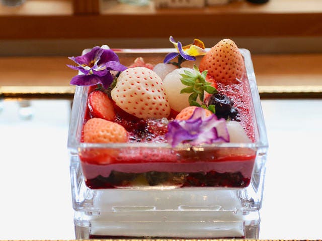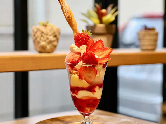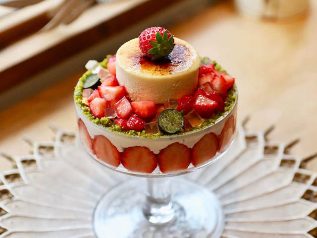 例えば、イチゴのシーズンならば、数種類のイチゴをソルベやコンポートに仕立て、デザートワインのジュレを合わせるなど、甘いだけじゃない大人が楽しめるパフェになっている。行列の絶えない同店だが、唯一無二のパフェは並んでも食べる価値あり。