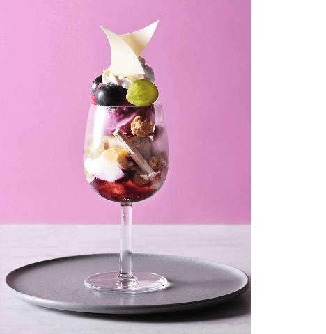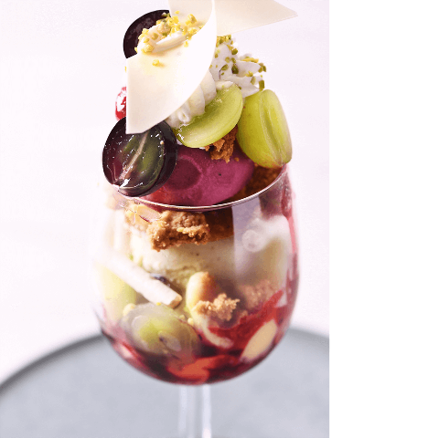 フレッシュな果実やピオーネのソルベで、ぶどう本来の甘酸っぱいおいしさをストレートに表現しつつ、豆乳のブラマンジェや玄米茶のジェラートが優しいアクセント。グラスの底にはカシスやレモンの酸味を効かせ、さっぱりと心地よい後味に仕上がっている。