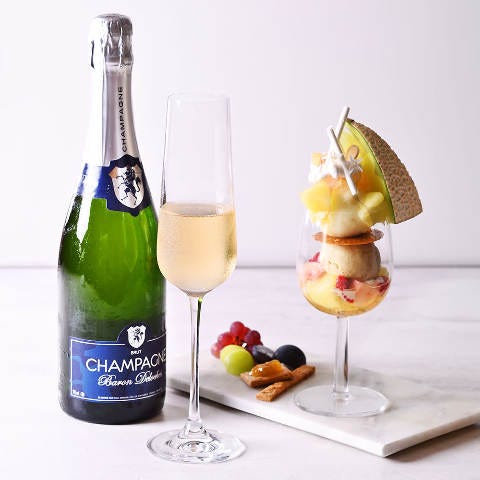 やわらかな果肉と高い糖度が特徴のメロン「肥後グリーン」の風味豊かなパフェには、エレガントで奥行きのある味わいのシャンパーニュがおすすめ。アルコールがさらに高貴なムードを演出してくれる特別メニューで、ゆったりとした時間を楽しみたい。
