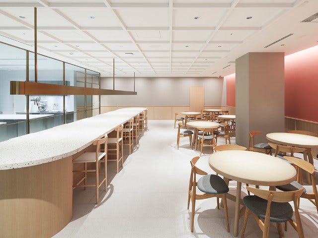 季節毎にフルチェンジするメニューは、代々木上原の人気パティスリー『BIEN-ÊTRE PÂTISSERIE(パティスリー ビヤンネートル)』のオーナーパティシエ・馬場麻衣子さんが監修。席は完全予約制となっており、ガラス張りのオープンキッチンが見渡せる開放的な店内で、ゆったりとした時間を過ごすことができる。