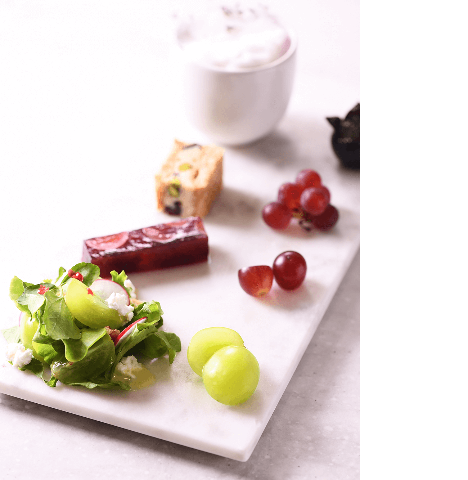 青系、赤系、デラウェア、黒系の4種のぶどうを、サラダやジュレ、レーズンサンドなど、それぞれの品種にマッチした調理法でアレンジ。