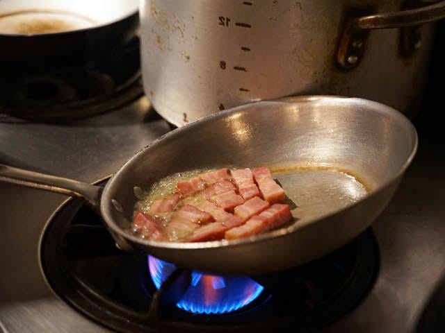 パスタは1.7mmの標準の太さ。ベーコンはボリューミーな厚切りなので、フライパンで表面をカリッと焼いても、ジューシーさを存分に楽しめる。