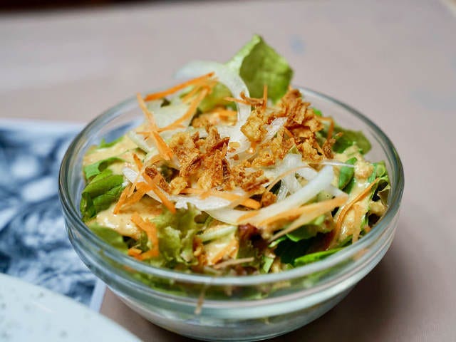ニンジンやタマネギをすりおろしたものに、すりゴマなどを加えて和風テイストに。クセになる独特の風味の正体はアンチョビだ。すりおろし野菜の甘みとアンチョビの塩味が、フレッシュなサラダの味わいを深めてくれる。