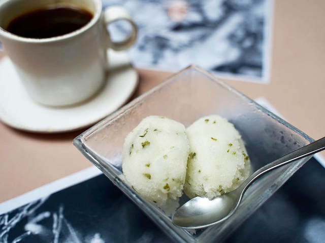 こちらは別注文になるが、カルボナーラの締めくくりにぴったりなデザート「紫蘇アイス」(写真上)。青じそは消臭効果もあり、梅酒のほんのりした甘さが口直しとなって、少しニンニクが効いたパスタの後味をさっぱりしてくれる。