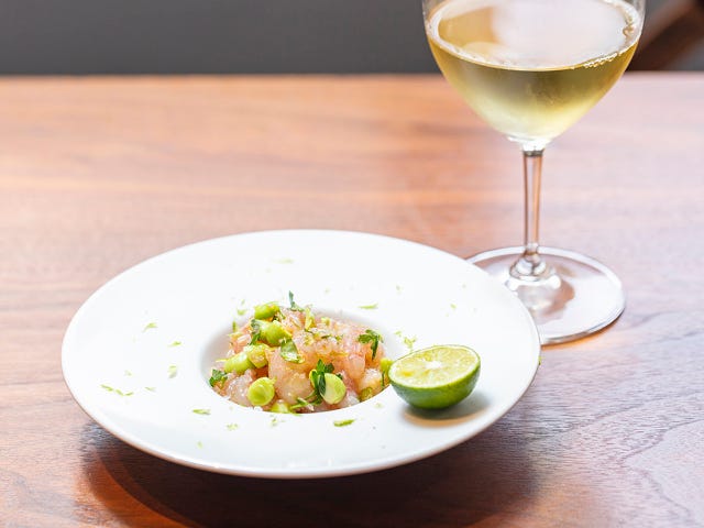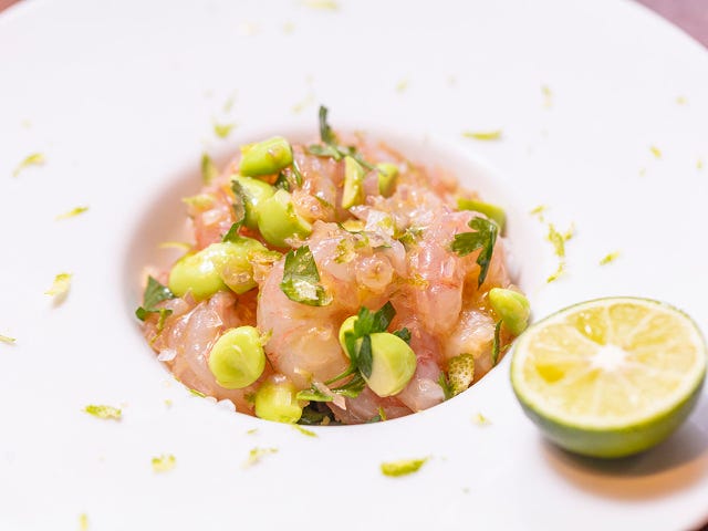 オリーブオイルとイタリア産の魚醤でマリネして、エシャロット、枝豆と合わせる。仕上げに徳島産のスダチをぎゅっと搾り、さらにスダチの皮をすりおろして散りばめる。