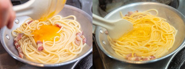 使用する麺は、2.4㎜の太麺スパゲットーネ。茹で時間は20分で、茹でた後の仕上げのタイミングが重要だ。スピーディーに混ぜ、卵黄のかたまり加減がほどよい頃に火から下ろす。なめらかなソースが太麺に仲良く馴染んでいる。