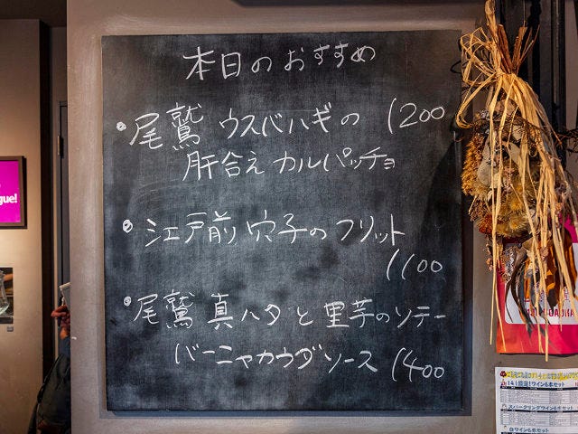 旬の食材をふんだんに使った料理は、A4用紙に綴られたメニューと黒板の「本日のおすすめ」から選ぶ。