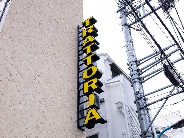「TRATTORIA」の大きな看板や太陽の絵柄のタイル。店の外にはイエローのクロスが掛けられたテーブルが並び、ワインや料理を楽しむ人たちで賑わっている。その光景は、さながらイタリアの街角そのもの。