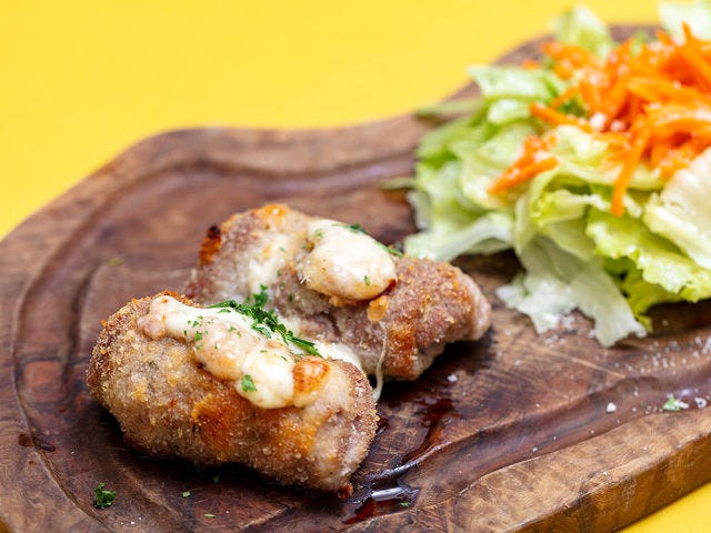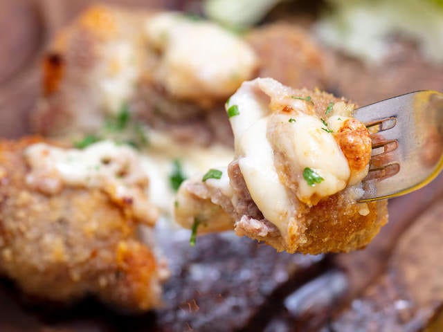 アッツアツの肉を切ると、中から溶けたモッツァレラチーズがとろ~り。目の細かいパン粉がカリカリと香ばしく、ミルキーなチーズと肉のうまみはまさに黄金の組み合わせ。この料理目当てに、遠方から訪れるお客がいるのも納得のおいしさだ。