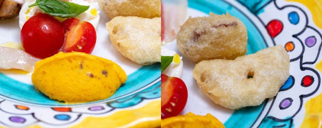 「カボチャの冷前菜」(写真上・左)は、ペーストにしたカボチャにレーズンとマスカルポーネチーズを混ぜたもので、「野菜のフリット」(同・右)は、レンコンとサツマイモにナポリ風の衣(小麦粉と水に酵母を混ぜて発酵させた衣)を付けて揚げている。