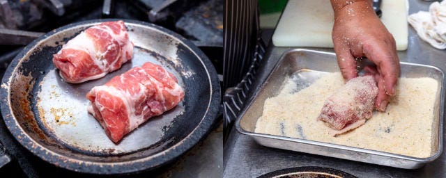 『タルタルギーナ』を初めて訪れた人のほとんどが頼むという「オリヴィアポークとモッツァレラチーズのボンベッテ」(写真上)。プーリア州の伝統料理で、豚の薄切り肉でモッツァレラチーズを巻き、パン粉を付けてオーブンで焼く。