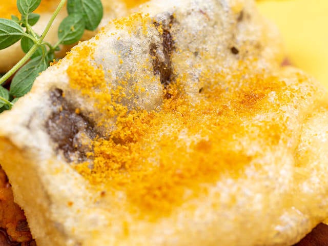 衣の表面にふりかけられているのは、サルデーニャ島のカラスミ。下に敷いてあるのは、甘酸っぱい野菜ソースのアグロドルチェ。ニンジンとタマネギを飴色になるまで炒め、塩やビネガーで味付けしている。野菜の甘さがソース代わりになり、淡泊なタラの身との相性は抜群。