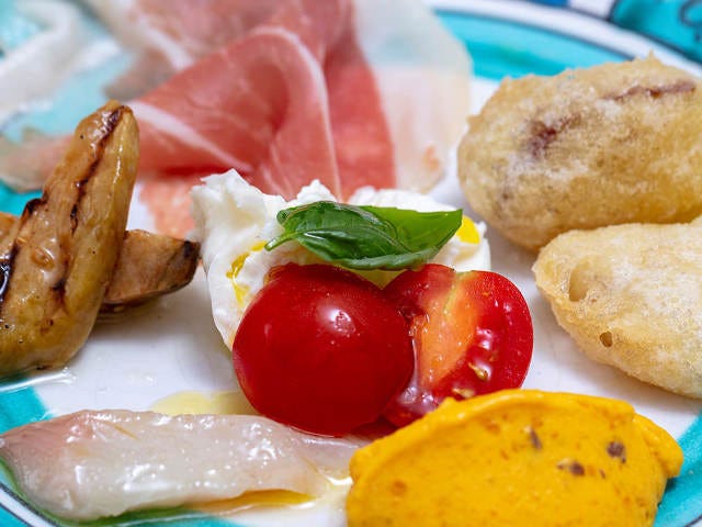 この日は全6種類。上から反時計回りに「パルマ産生ハム」、「白ナスのグリルマリネ」、「シイラのカルパッチョ」、「カボチャの冷前菜」「野菜のフリット2種」そして、中央が「ブッラータチーズのカプレーゼ」。