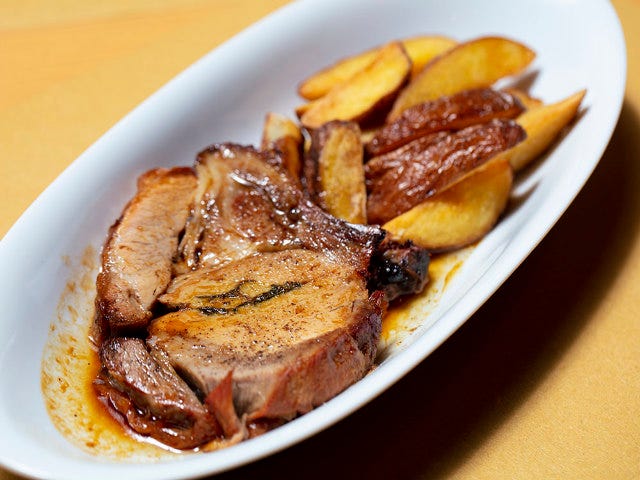 このフライドポテトを添えて登場する「アリスタ 豚ロースの香草焼き」(写真上)。沖縄産の豚肉を主役に、ローズマリー、セージ、ニンニクをふんだんに使った一皿。じっくりと3時間かけて豚肉を焼き切り、その焼き汁を白ワインと煮詰めてソースにする。なんとも骨太で、ボリューミーなメイン料理だ。