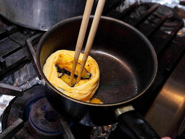 見た目も味も感動し、そのレストランの厨房に入れてもらって作り方を習った自慢の料理。ナスはゆっくり時間をかけてソテーするが、溶き卵をフライパンに注いだら、さっと素早く混ぜて、瞬く間に完成する。