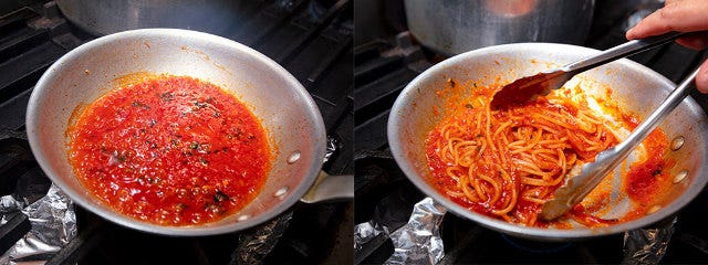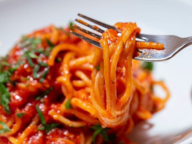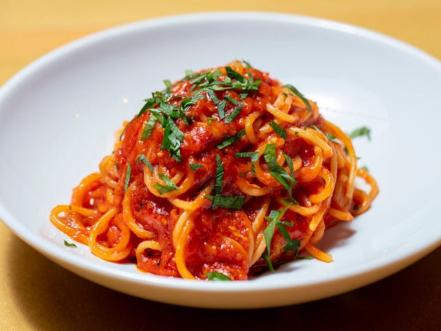 かなりアルデンテに茹で上げるスパゲッティは、弾力たっぷり、歯ごたえを存分に楽しめる。噛めば噛むほど広がる小麦の風味を感じたい。