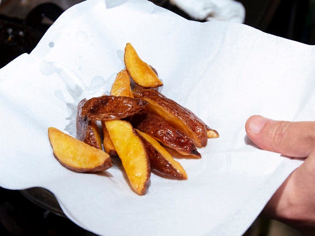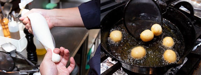 「イタリアで食べて、このおいしさは何だ!?」と相成り、レシピを教わったという。メークインを使い、3分揚げて3分休ませる、を繰り返すこと10回! そうして完成するフライドポテトは、中がほどよく蒸され、外がカリッパリッ。ジャガイモのおいしさが凝縮されている。